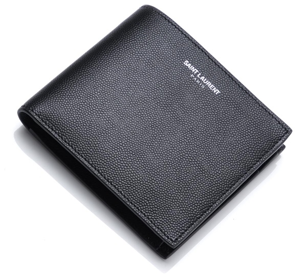 サンローランのこちらの2つ折り財布は、シンプルなデザインが人気となっています。加工によってできた細かなシワ模様がオシャレで、ブランドロゴもちょうどいい大きさで配置されています。