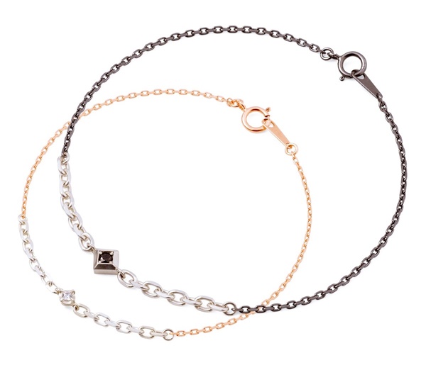 ピンクゴールドとブラックは定番のカラーですが、途中からチェーンの大きさや色が変わり、中央には石座とストーンが配置されています。