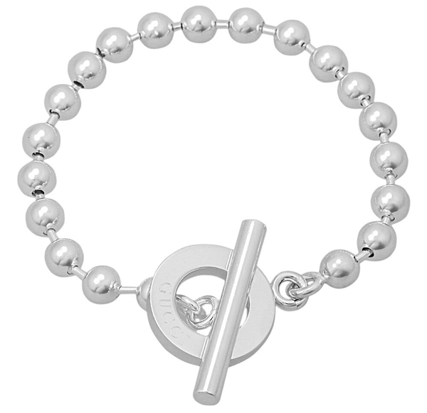 こちらはグッチのシルバーブレスレットです。リングの中にバーを通して腕に固定するタイプとなっています。ボールが1周配置されていて存在感がありますよね。