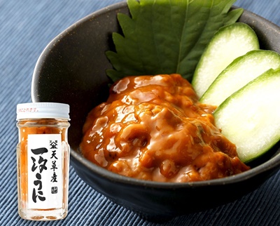 こちらは北海道の積丹産のムラサキウニを塩で一夜漬けにした一品です。瓶詰めされたうにが2本届き、1本あたり60gのうにが入っています。