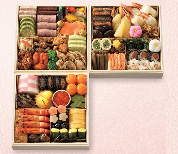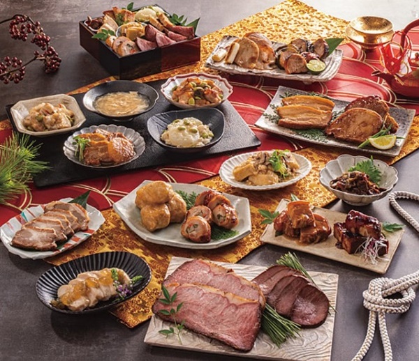 和洋中のさまざまな味が楽しめるおせちで、かまぼこや黒豆などの正月料理の定番から、エビチリ、ローストビーフ、鶏の甘辛炒めなどのバラエティ豊かな料理も入っています。