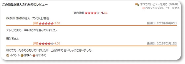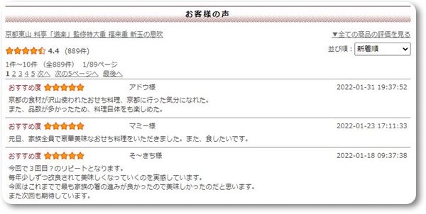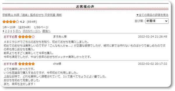 こちらは「清新」の匠本舗でのレビュー。5点満点中4.2点と割と高めで、口コミも800件以上と多いです。このことから道楽のおせちは毎年多くの人が注文しているのがわかります。