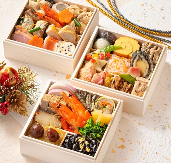 重箱のおせちはかまぼこやかれい、伊達巻、きんとんといった和風を感じさる内容で、カップの方は有頭エビのスモーク、合鴨と野菜のマリネなどの洋風のメニューとなっています。
