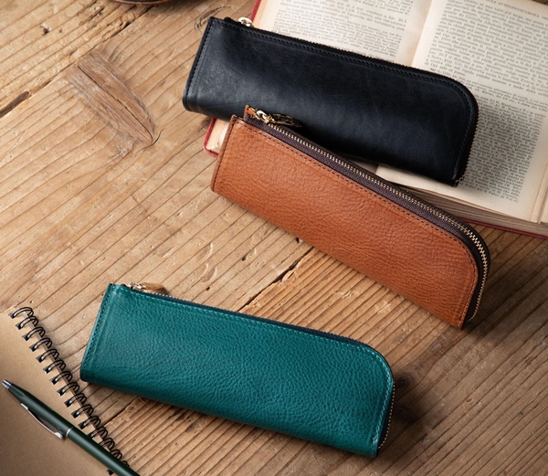 IKETEI ONLINEで販売しているこちらのペンケースは、デザイン面で特におすすめです。シンプルなデザイン、そして丸みのある形状は洗練された印象で、ツヤのある美しい革素材とマッチしています。