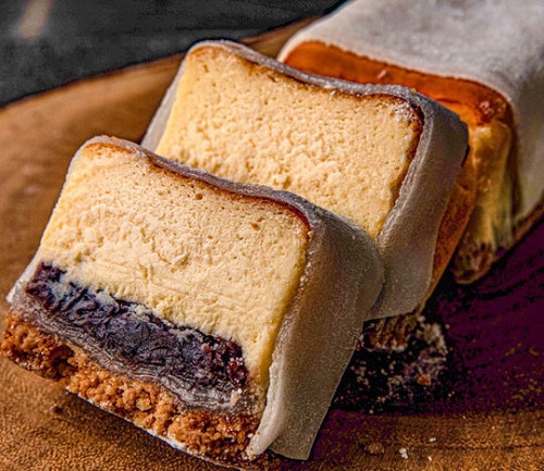 こちらの『羽二重光絹ベイクドチーズケーキ』は、和菓子とチーズケーキが融合した新しいタイプのスイーツです。明治からある福井県発祥の和菓子「羽二重餅」をベイクドチーズが包み込んでいます。