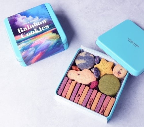 『レインボークッキー缶』は写真のようにカラフルな見た目が印象的なクッキーです。野菜や果物、お茶などの素材の色を活かして、これら鮮やかな色合いを作り出しています。